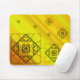 Three styles of hand-drawn fractals, including Siepinski triangles, Apollonian gaskets, and a similarly themed square design, make up the layers of this geometric mandala, overlaid onto a bright yellow and orange gradient.
