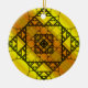 Three styles of hand-drawn fractals, including Siepinski triangles, Apollonian gaskets, and a similarly themed square design, make up the layers of this geometric mandala, overlaid onto a bright yellow and orange gradient.