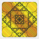 Three styles of hand-drawn fractals, including Siepinski triangles, Apollonian gaskets, and a similarly themed square design, make up the layers of this geometric mandala, overlaid onto a bright yellow and orange gradient.