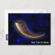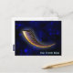 Features a fractal rendering of a shofar (ram's horn) superimposed on a starry background image. The predominate colours are yellow, white and blue. Add your own text. For Yom Kippur or Rosh Hashanah use. A shofar is made from the horn of a ram or other kosher animal. It was used in ancient Israel to announce the New Moon (Rosh Chodesh) and call people together. It was also blown on Rosh Hashanah, marking the beginning of the New Year, signifying both need to wake up to the call to repentance, and in connection with the portion read on the second day of Rosh Hashanah, the Binding of Isaac (Genesis, chapter 22) in which Abraham sacrifices a ram in place of his son, Isaac. The shofar is often mentioned in the Tanach, Talmud and in rabbinic literature. It was used to announce the start of holidays, in processions and even to mark the start of a war. Perhaps the most famous biblical reference to the shofar occurs in the Book of Joshua, where shofarot (plural of shofar) were used to capture the city of Jericho. The shofar was blown and the Jews were able to capture the city. The shofar was commonly taken out to war so the troops would know when a battle would begin. The person who would blow the shofar would call out to the troops from atop a hill. All of the troops were able to hear the call of the shofar from their position because of its distinct sound. "Then the LORD said to Joshua… March around the city once with all the armed men. Do this for six days. Have seven priests carry trumpets of rams' horns in front of the ark. On the seventh day, march around the city seven times, with the priests blowing the trumpets. When you hear them sound a long blast on the trumpets, have all the people give a loud shout; then the wall of the city will collapse and the people will go up, every man straight in. (Joshua 6:2-5)" In the Temple in Jerusalem, the shofar was sometimes used together with the trumpet. On New Year's Day the principal ceremony was conducted with the shofar, which instrument was placed in the centre with a trumpet on either side; it was the horn of a wild goat and straight in shape, being ornamented with gold at the mouthpiece. On fast days the principal ceremony was conducted with the trumpets in the centre and with a shofar on either side. On those occasions the shofarot were rams' horns curved in shape and ornamented with silver at the mouthpieces. On Yom Kippur of the jubilee year the ceremony was performed with the shofar as on New Year's Day. Rosh Hoshana is the Jewish New Year. A ceremonial horn, called a “shofar” is blown, reminding Jews that God is king. A feast with symbolic food is eaten on Rosh Hashana, and the next ten days are spent in repentance. Rosh Hashana ends on Yom Kippur. Yom Kippur is a day of judgment, during which prayers are made asking for forgiveness. On Rosh Hashanah and other full holidays (Day of Atonement, Ingathering of the harvest [Succot], Passover and the Feast of Weeks – Pentecost) a single Priest perfected two sacrifices in honour of the full holiday, On Rosh Hashanah, something special occurred during the special sacrifice. Arguably two Shofar Sounders played the long notes and one Trumpet player played the short note. Accordingly, Rosh HaShanah is called Yom Teruah (the day of the blast) Otherwise, the Trumpets had “top billing.” Rosh Hashanah27a, supports this claim: “Said Raba or it may have been R. Joshua B. Levi: What is the scriptural warrant for this? – Because it is written, “With trumpets and the sound of the Shofar shout ye before the King in the Temple, we require trumpets and the sound of the Shofar; elsewhere not.” Rosh Hashanah announced the jubilee year, and the sound of the shofar on Yom Kippur proclaimed the actual release of financial encumbrances. In post-Biblical times, the shofar was enhanced in its religious use because of the ban on playing musical instruments as a sign of mourning for the destruction of the temple. The shofar continues to announce the New Year and the new moon, to introduce Shabbat, to carry out the commandment to sound it on Rosh Hashanah, and to mark the end of the day of fasting on Yom Kippur once the services have completed in the evening. The secular uses have been discarded (although the shofar was sounded to commemorate the reunification of Jerusalem in 1967) Today the shofar is primarily associated with Rosh Hashanah. (meaning “head of the year” in Hebrew) and and Yom Kippur. The shofar is such an important part of Rosh Hashanah that another name for the holiday is Yom Teruah (“day of the shofar blast”). The shofar is blown one hundred times on each of the two days of Rosh HaShanah. If one of the days of Rosh HaShanah falls on Shabbat, however, the shofar is not blown. According to the famous Jewish philosopher Maimonides, the sound of the shofar on Rosh HaShanah is meant to wake up soul and turn its attention to the important task of repentance (teshuvah). It is a commandment to blow the shofar on Rosh HaShanah and there are four specific shofar blasts associated with this holiday: Teki’ah – An unbroken blast lasting about three seconds Shva’rim – A teki’ah broken into three segments Teruah – Nine rapid fire blasts Tekiah Gedolah – A triple teki’ah lasting at least nine seconds, though many shofar blowers will attempt to go significantly longer, which the audience loves. The person who blows the shofar is called a Tokea (which literally means “blaster”) and it is no easy task to perform each of these sounds. Scroll down to the end of this article for a link to a video demonstrating the four shofar sounds of Rosh HaShanah. There is a great deal of symbolism tied in with the shofar and the legal requirements for what constitutes a proper shofar. The shofar of Rosh Hashanah, whose purpose it is to rouse the Divine in the listener, may not be constructed of an artificial instrument. It must be an instrument in its natural form and naturally hollow, th