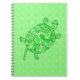 Mixed media digital graphic of a turtle in a fractal pinwheel pattern against an arabesque tiled background - shades of green ranging from pastel lime to deep emerald