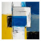 A burst of vibrant colours like yellow, blue, and white, interwoven with black strokes, forms an abstract composition reflecting chaos and balance. Paint layers suggest emotional depth and movement, inviting personal interpretation.