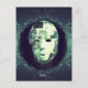 A haunting, surreal portrayal of a fractured mask suspended in a dark, ethereal void. The mask's broken, patchwork surface reflects icy textures, contrasted by a dangling monocle and a single green thread, evoking a cryptic connection to unseen forces. Beneath it, the simple yet chilling word "Hello." invites an unsettling encounter with the unknown.