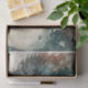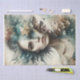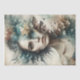An evocative tissue paper design for decoupage, depicting a mysterious female figure emerging from a fusion of nature and the elements. Her face is seamlessly blended with a cascade of ethereal textures — shards of cracked earth, delicate leaves, and swirling clouds of watercolor hues in teal, sepia, and grey. Her piercing gaze exudes serenity and strength, as if embodying the balance between decay and renewal. The intricate transitions between the human form and abstract natural patterns create a sense of transformation, perfect for art projects that explore beauty, fragility, and the connection between humanity and nature.