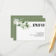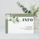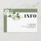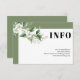 This wedding details enclosure card showcases a sophisticated design with a touch of nature. A white frame holds your text, while beautiful sage green borders adorn the left and upper side, adding a subtle pop of colour. In the upper left corner, a delicate branch adorned with white flowers and lush greenery adds a touch of elegance. The word 'INFO' is displayed in bold typography, creating a striking contrast against the serene backdrop. On the back there is a QR code. This design effortlessly combines classic elements with natural beauty, making it the perfect addition to any wedding invitation suite. The cover has been designed using some assets from Freepik.com