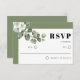 This wedding RSVP card showcases a design with a white frame and delicate white flowers, complemented by a branch of eucalyptus. The sage green borders add a touch of elegance to the overall aesthetic. The upper left corner is adorned with a graceful branch of eucalyptus with white flowers, creating a captivating focal point. The "RSVP" is presented in bold typography, adding a modern and sophisticated touch. The back of the card is adorned with a soothing sage green colour, completing the harmonious design.