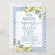 Our main squeeze first birthday invitation featuring some yellow and white flowers, lemons and foliage arrangements and a Mediterranean blue tile border. Ideal for a spring or summer first birthday but can be used for any age.