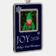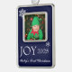 Framed photo ornament is shown in silver tone metal with a deep blue color background and a sample photo, customize this ornament and just change the photo to your own great photo and change the text if you wish with this template.
