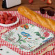 Based on a French floral design from 1830, garden flowers on a white background including blue forget me nots and orange nasturtiums.