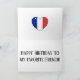 Beautiful design includes happy balloons and ticker tapes with the words "Happy Birthday", all in the colours of the France flag. Design is finished with the heart in the France flag colours and the Birthday message which is completely customisable. This colourful birthday card is the perfect present for your friend from France.