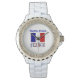 Personalised faceless women's watch shows the French Flag with the word FRANCE below in letters coloured with the tricolor. Above is a spot for your name or someone else's, so you can create a gift or a personalised look. Cool for Bastille Day. Great gift for her. Fun to wear to family reunions.