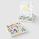 The coasters are gorgeous, a quality feel and heavy weight. They look like a precious archeological find. A rustic stone juxtaposed with a modern floral black and white print. I like the way the print goes slightly imperfect on the cut stone edges giving them a kind-of natural beauty.