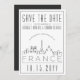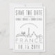 A unique wedding save the date invitation for a marriage taking place in the beautiful country of France. This invitation features a stylised illustration of the city's unique skyline with its name underneath. This is followed by your wedding day information in a matching open-lined style. On the reverse side of the invitation is a deep grey colour to complement the look and feel. All individual elements of the invite card are unlocked so feel free to change any details necessary such as font sizes, and more by using the customisation function. You can add a photo to the reverse side and add a black and white filter to it. Have fun being creative.