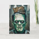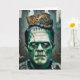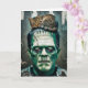 A grey tabby is taking a nap on Frankenstein's monster's head.