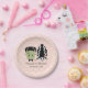 These pink and black Love at Fright Halloween themed couples wedding, couples and bridal shower, engagement party, rehearsal dinner and anniversary celebration paper plates with the monster of Frankenstein and the Bride of Frankenstein on a heart polka dot background are more mushy than monstrous and more sweet than spooky. The groom wears a bow tie and the bride wears a flower with a printed diamond look solitaire in her hair. Please note, there are no 3 dimensional embellishments added to this design. It is printed flat. Add the names of the bride and groom or happy couple and their event date. Artwork © Chrissy H. Studios, LLC. All Rights Reserved.