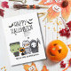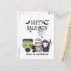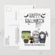 Greet your family and friends with this whimsical, spooky Halloween Greeting Postcard! The design captures the eerie magic of the season. Our design includes illustrations of a cute little scare squad featuring a Frankenstein, a Mummy, a Grim Reaper with his sickle, and cute black cat wearing a pumpkin hat. A group of scary bats are flying overhead the "Happy Halloween" greeting in a fun font and spooky spiders are busy making their spiderwebs. It’s the perfect blend of playful and spine-chilling!