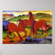 Franz Marc Grazing Horses poster. Oil on canvas from 1911. Franz Marc was a great painter of horses throughout his career. Grazing Horses is one of his prettiest works. Unlike his other abstract horse paintings, Grazing Horses features three natural brown horses standing amongst hills as the setting sun turns the landscape a range of beautiful colours. A pretty gift for fans of Franz Marc, Horse paintings, Expressionism, and animal art.