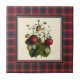 Ceramic tile trivet with a digitally cleaned vintage botanical illustration of strawberries on a light gold parchment texture background. Framed with the Fraser of Lovat family modern clan tartan pattern. Traditional vintage Scottish plaid from 1893 in bright red, navy blue, forest green and white.