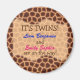 This magnet displays a giraffe print background along with the text "It's twins! [Babies' Names] are on the way!" This is a great item for giraffe themed, animal themed, safari themed, zoo themed, or jungle themed baby showers.