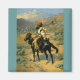 Classic Remington, focused on a single person astride a horse but with many other figures or vistas in the background.