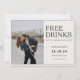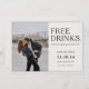 Fun and casual Save the Date announcement featuring "Free Drinks" in a fun script. Announce to your friends and family that you are getting married! Customise with your information and photo.
