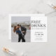 Fun and casual Save the Date announcement featuring "Free Drinks" in a fun script. Announce to your friends and family that you are getting married! Customise with your information and photo.