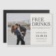Fun and casual Save the Date announcement featuring "Free Drinks" in a fun script. Announce to your friends and family that you are getting married! Customise with your information and photo.