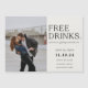 Fun and casual Save the Date announcement featuring "Free Drinks" in a fun script. Announce to your friends and family that you are getting married! Customise with your information and photo.