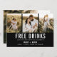 Funny wedding save the date cards in a modern three photo black design that reads "Free drinks and we're getting married". Customise the front of the card with 3 of your engagement photos and wedding details. You can also add a vertical photo to the back.