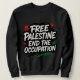 Show your support for justice and human rights with this bold "Free Palestine – End the Occupation" design. Featuring powerful white lettering with distressed red, black, and green paint strokes inspired by the Palestinian flag, this shirt makes a strong statement for freedom and solidarity. Perfect for rallies, activism, or anyone who stands for peace, equality, and human rights worldwide.
