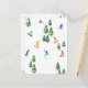 Cool whimsical illustration art of colourful snowboarders, snowboarding downhill in mountains among pine, spruce, fir trees on fresh snow powder. Snowboard and xmas outdoor sport in a winter forest. Snowboarder gifts. Snowboarding Christmas decor.