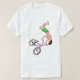 A BMX rider flying through the air. The daring rider is shirtless. The cartoon BMX bike is pink.