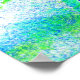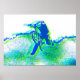 A bright blue and green coloured bicycle rider doing freestyle jump stunts off a bike ramp. Pop art style artwork derived from an original photograph taken at a bike show.