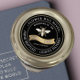 Black Label with Vintage French Bee features a double white border circling your Apiary Name and Location. Apiary name is displayed in curved text across the top and the beekeeper's city and town are written in curved text underneath apiary name. There is a delicate white and taupe border near the outer perimeter of the label. The words “PURE RAW HONEY" are written on a wavy gold gradient banner in centre of label (and may be deleted & substituted for the word “HONEY" by “unhiding” the eyeball icon on the left of the word HONEY on line 1 in DESIGN PANEL)