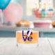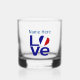 Personalised whiskey glass features the word LOVE in blue letters. A heart shaped flag of France serves for the O in LOVE. Great gift for Father's Day or Mother's Day. Fun for playing golf on Bastille Day. Always cool for family or friends reunions. Cool Christmas or Hanukkah gift, too.