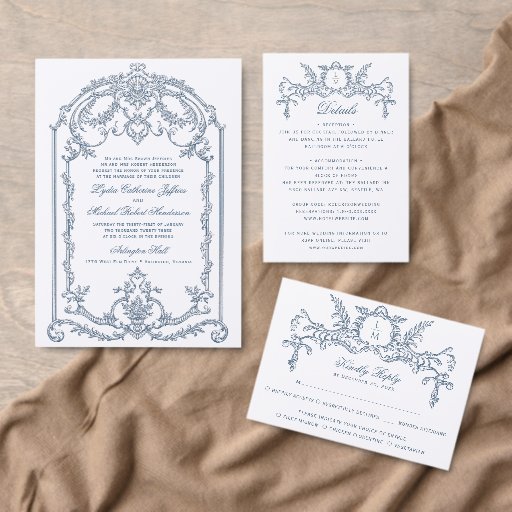 French Blue Ornate Baroque Monogram RSVP Card
