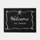 This elegant and stylish black doormat features a whimsical, hand-drawn white frame with a trendy French bow, and chic vintage script that says "welcome".