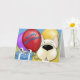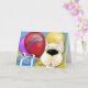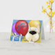 Adorable Big Nose French Bulldog with a birthday present and holding balloons in his mouth. Balloon reads Rappy Rirthday!