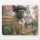A French bulldog wearing a beret sits on a Paris park bench, surrounded by cherry blossoms, with the Eiffel Tower in the background