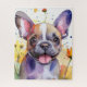 A digital art image of a French Bulldog with a playful expression, surrounded by vibrant and colourful flowers. The background features splashes of bright colours, giving the scene a lively and energetic feel.