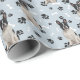 An image of a black and white French Bulldog is the feature in the pattern on this all occasion gift wrapping paper. The dog sits amid a pattern of black paw prints and white bones, and is repeated on a silver blue background.