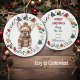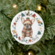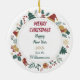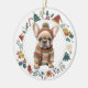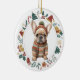 This cute Holiday ornament features a watercolor image of an adorable French Bulldog puppy dressed in his winter sweater and hat. The image is framed within a colourful circle wreath made up of various Holiday images, including a snowman, bells, candy cane, stocking, holly, and more! The back of the ornament has the same wreath image with your custom text in green, gold, and red. See more Frenchie designs at Dog Village.