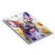 A digital art image of a French Bulldog with a playful expression, surrounded by vibrant and colourful flowers. The background features splashes of bright colours, giving the scene a lively and energetic feel.