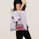 French Bulldog puppy, 7 month old, with pink bow tie and as background wallpaper white, with pink polka dots.