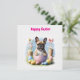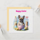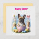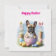 French bulldog wishes Happy Easter with many pastel colored eggs and a pink ribbon. The cute dog sits in an Easter egg and has brought great gifts. Colored spring flowers and a blue sky round off the beautiful animal motif. For every dog lover a beautiful gift.