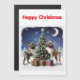 French bulldoggs stand on the decorated Christmas tree. The big fir tree likes the bulldog with many lights, candles and Christmas gifts. The moon shines and the stars shine solemnly.