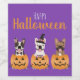 Illustration of three French Bulldog puppies of different colours in pumpkins dressed in Halloween attire.