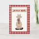 This fun, country style greetings card in the French language has a plaid pattern background in red and white with fun Christmas font and a cute, whimsical cartoon image of Rudolf the red nose reindeer. Incoporates some graphics by Whimsy Primsy.