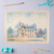 Beautiful vintage illustration of a French country house surrounded by trees and a wide path. Intricate architecture in a dreamy watercolor in blues, reds and greens. Great for decoupage.