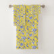 A Trendy and Beautiful French Country Bathroom Towel Set Done In A Yellow Background With Blue Flowers.